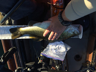 I continued this all morning moving the boat into new positions, but I stopped getting any hits on the spinnerbait do I went straight to drop shot I caught a 12" and 12.75" fish as I was hoping he would go the 13" but only with mouth open so back he went. Two cast later I felt a tic and a nice pull. Dropped the rod tip down and set the hook. This fish went airborne instantly, my next keeper I was thinking. The fish made three more jumps then under the boat I was able to keep it out of the tulles, as it came up got it in the net. 18" fish was my second keeper.